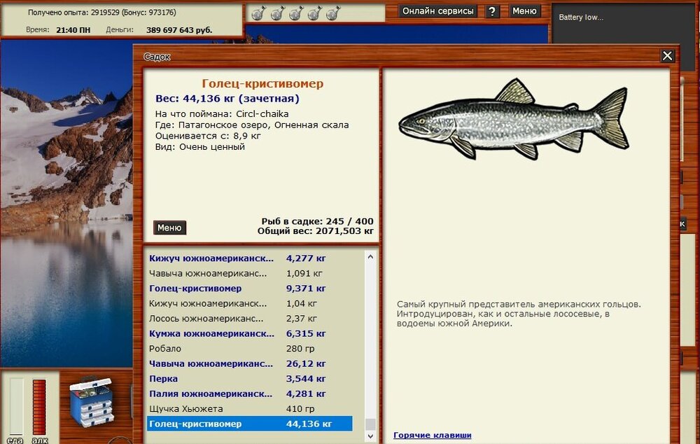 крупные экземпляры очень редки. Но на Салмон отлично ловится мелочь.В основном гобуша. Прилов ЗНАЧИТЕЛЬНЫЙ сима, микижа, инанга, кокани. Сиа и микижа часто зачетные. Рабочие блесны сапсан, орлан, рапан и блюсканер. Малые проводка М и СР. на медл проводке ловится ГАЛАКСИЯ - опыта на сухую от 3 до 8 лям. Поймал 3 шт. примерно за неделю реала, Голец Чукотский. Я поймал 2 мелких. по 200-300гр. Опыт за них меньше чем за галаксию, но и вес маленький. За несколько Кг веса будет реально много. Клев примерно 130-160 рыб в день. Ночью клева почти нет. Короче Колпаки, но более прибыльные))