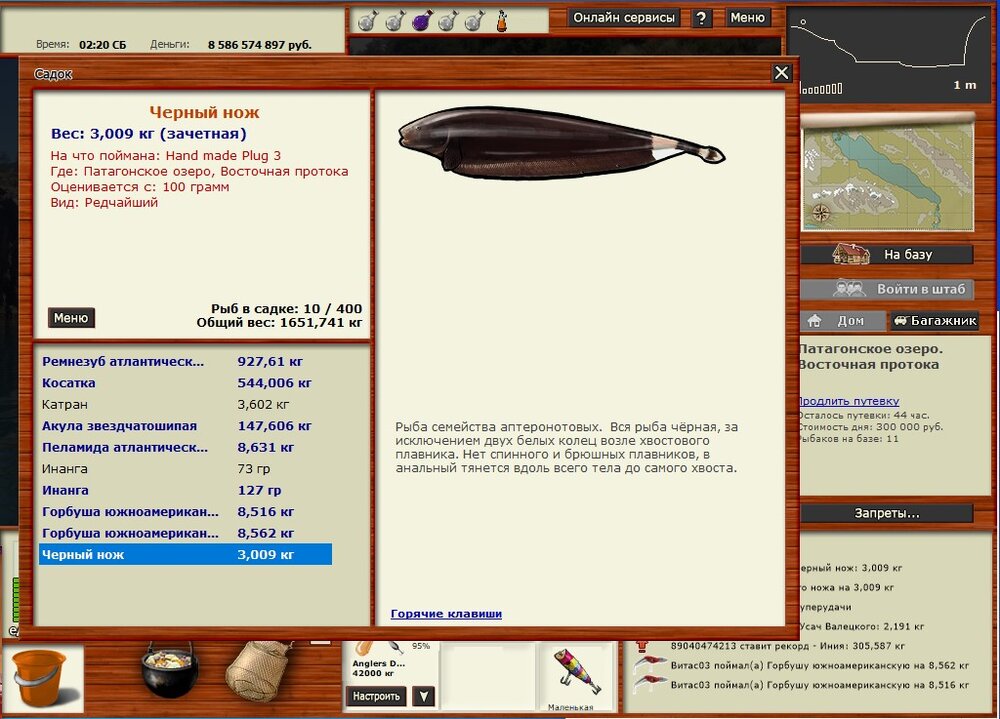 Черный нож. Патагонское озеро: Восточная протока, Hand made Plug 3 м/ср, 3,34 чат. Спин с кракеном, кровь гребнистого, отвар удачи, с первого СУ.