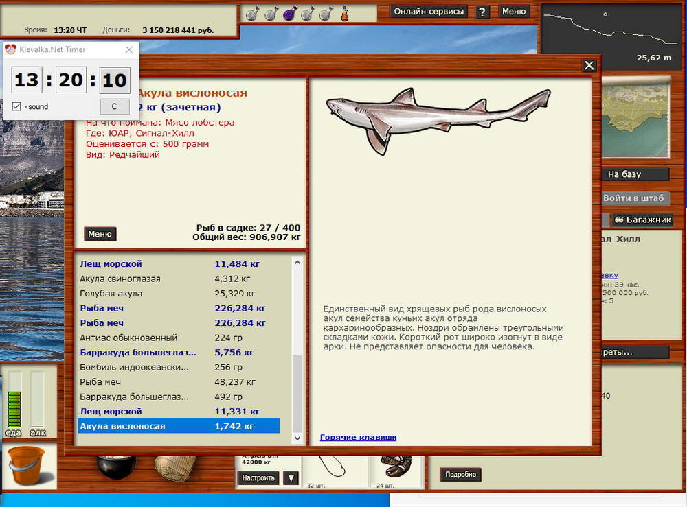 Акулы. ЮАР, Устричная ферма. До взятия задания еле проклевывалась в яме 16.62 рюкзак. Взял задание и 11 игровых ночей ни одной поклевки. Нашел в 11.71 уда (сразу за ямой 12.33). Там и отловил на БЖ почти за реальные сутки, особо не напрягаясь. Леску ставил на 2800, чтобы лишнее не тягать, т.к. там же редко, но клюют косатки. Использовал кровь гребня, отвары мудрости, удачи и силы.
