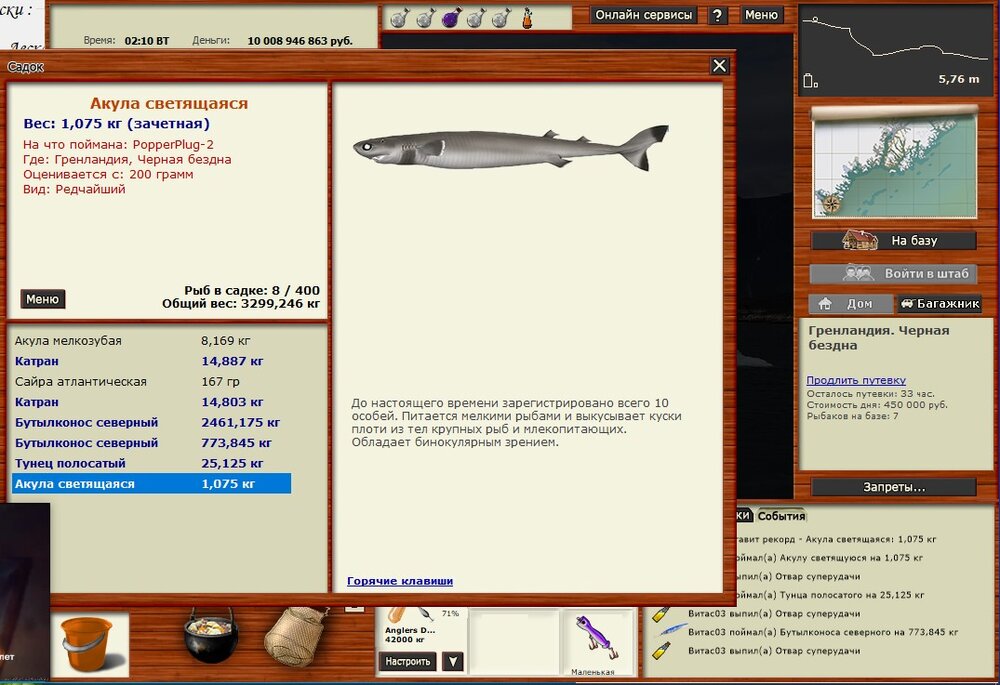 Акула светящаяся 1,075 кг. Поймана на Гренландия: Черная бездна, PopperPlug-2 м/ср, 29,09 инд. уды. Спин с кракеном, под кровь гребня, отвар удачи и СУ