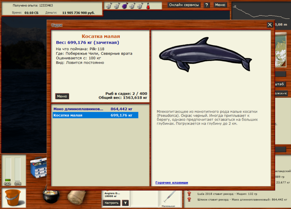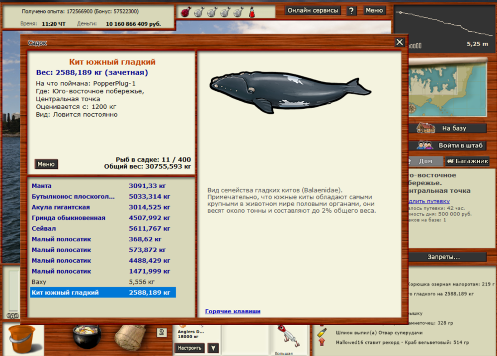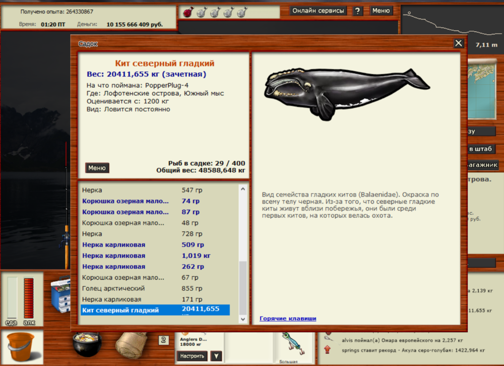 Всем привет, поймал двух китов: 1)Кит южный гладкий был пойман на ЮВП, локация - центральная точка. Ловил на PopperPlug-1 большой при медленной проводке. Заброс 39,77 над игроками. Сначала попробовал его взять под китовый, но поймав 4 малых полосатика решил взять его под СУ и в итоге со 2-го отвара он клюнул. 2) Кит северный гладкий был пойман на лофотенских островах, локация - южный мыс. Ловил на PopperPlug-4 большой при средней проводке. Заброс 31,79 над чатом. Решил его ловить ночью под китовый, т.к. днём под этот отвар часто клюёт сейвал. В итоге потратил на него 4 китовых отвара. Из прилова был кашалот, кашалот-альбинос и кит горбатый альбинос. Всем удачи в поимке этих рыб!.