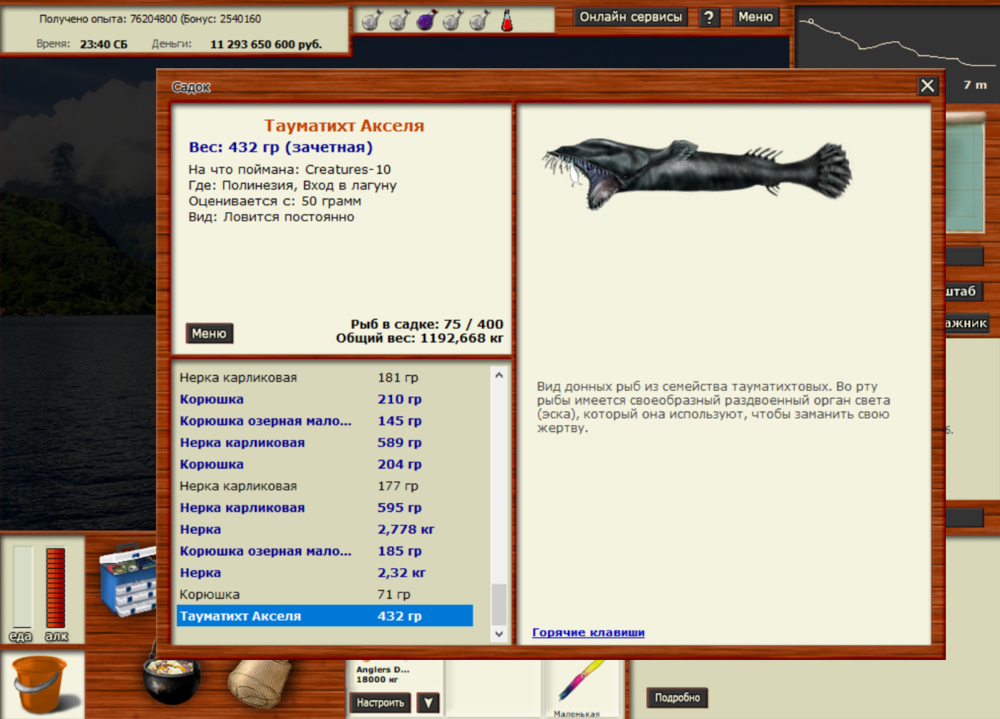 Всем привет, поймал третью рыбку из этого квеста: Тауматихт Акселя был пойман на Полинезии, локация - вход в лагуну на creatures-10 маленький при медленной проводке. Заброс 50,90 левый край лески. Клюнул со 2-го отвара СУ. Всем удачи в поимке этой редкой рыбки.