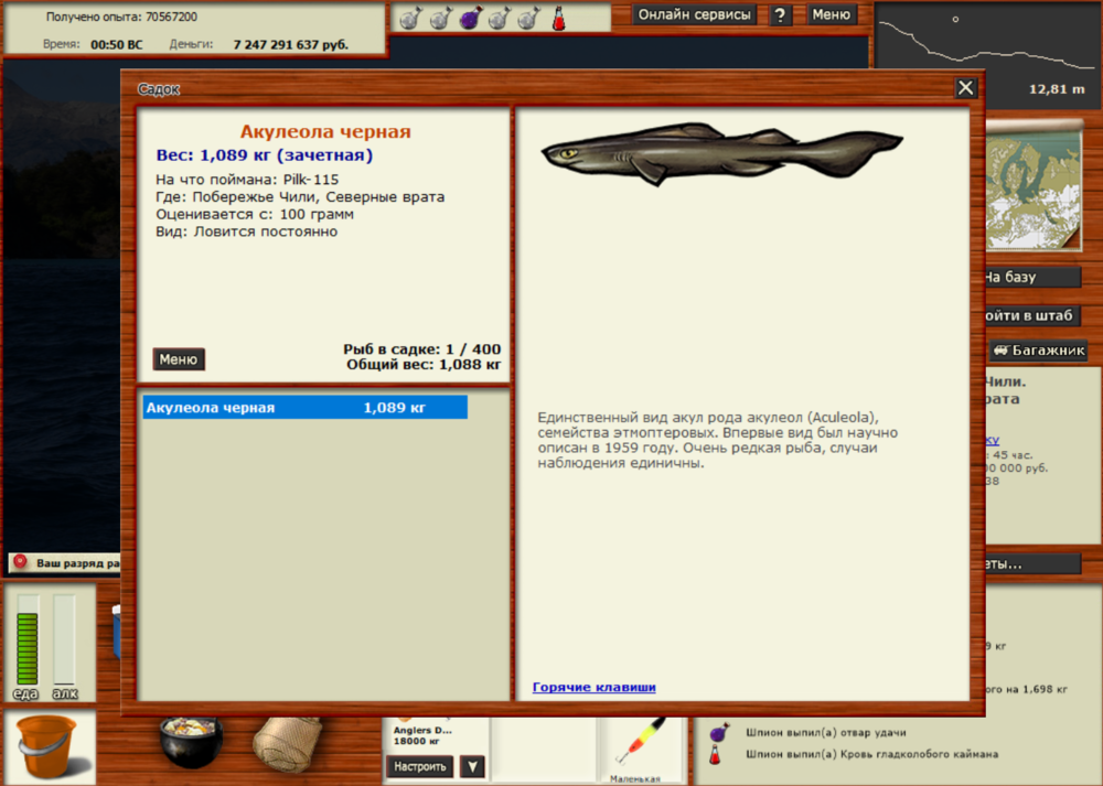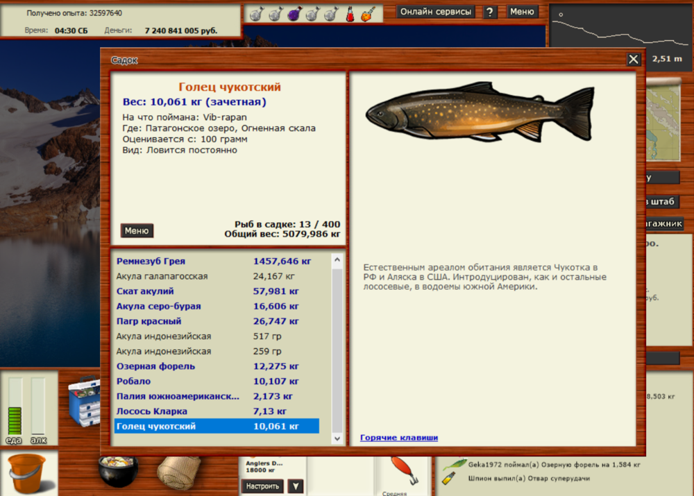 Всем привет, поймал первые 2 рыбы из данного квеста: 1) Голец чукотский был пойман на Патагонском озере, лока - огненная скала, на vib-rapan средняя при медленной проводке. Заброс 7,42 над чатом. 2) Акулеола черная была поймана на Побережье Чили, лока - Северные врата, на pilk-115 маленький при медленной проводке. Заброс 15,01 левый край удочки. Обе рыбы были выловлены с 1-го отвара СУ. Всем удачи в поимке этих видов рыб!.