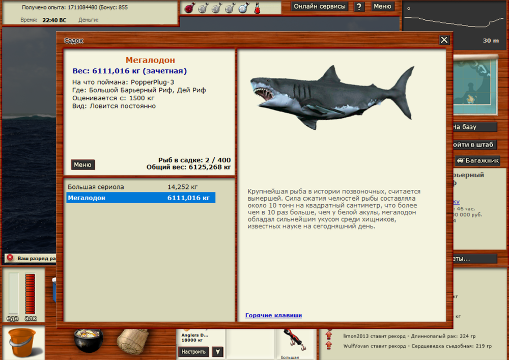 Всем привет!, поймал мегалодона на ББР, локация Дей Риф. Клюнул на PopperPlug-3 большой при медленной проводке. Заброс 40,36 чат-игроки. Клюнул со 2-го СУ. Всем удачи в поимке этой акулы!!!