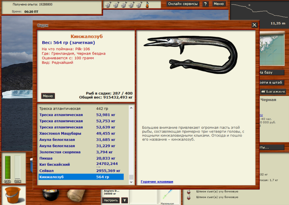 Всем привет! Кинжалозуб 564 грамм. Поймана на Гренландия: Черная бездна, Pilk-106 маленький медленно. Заброс 16,53 левее книги. Клюнул под СУ. Всем удачи в поимке данного вида!