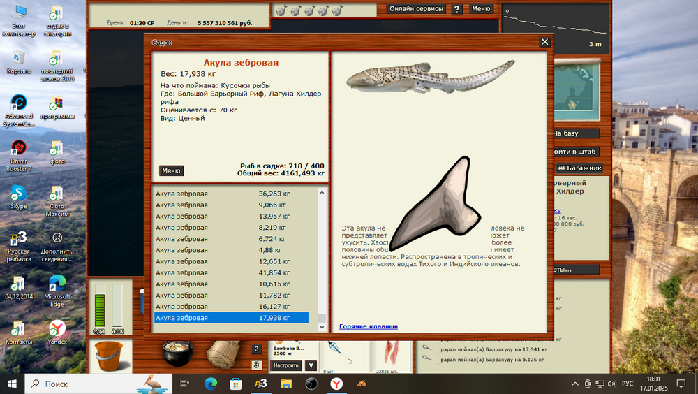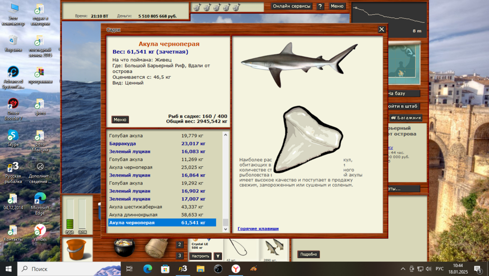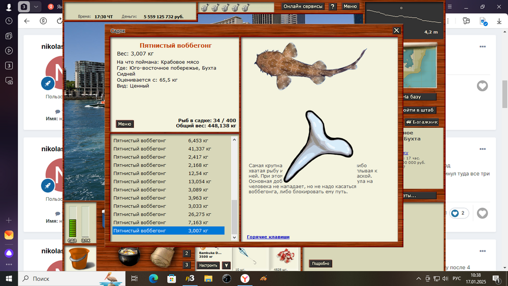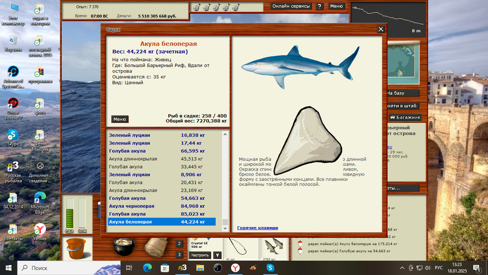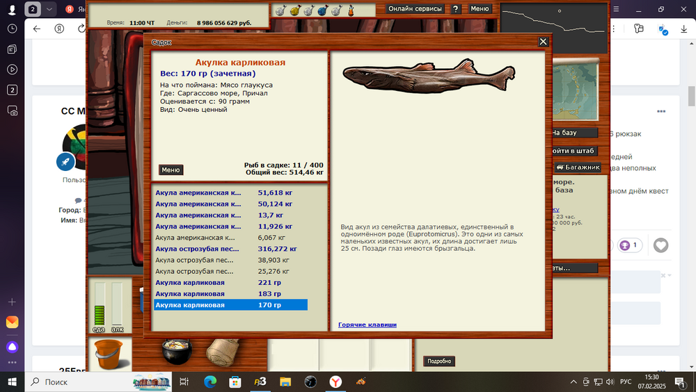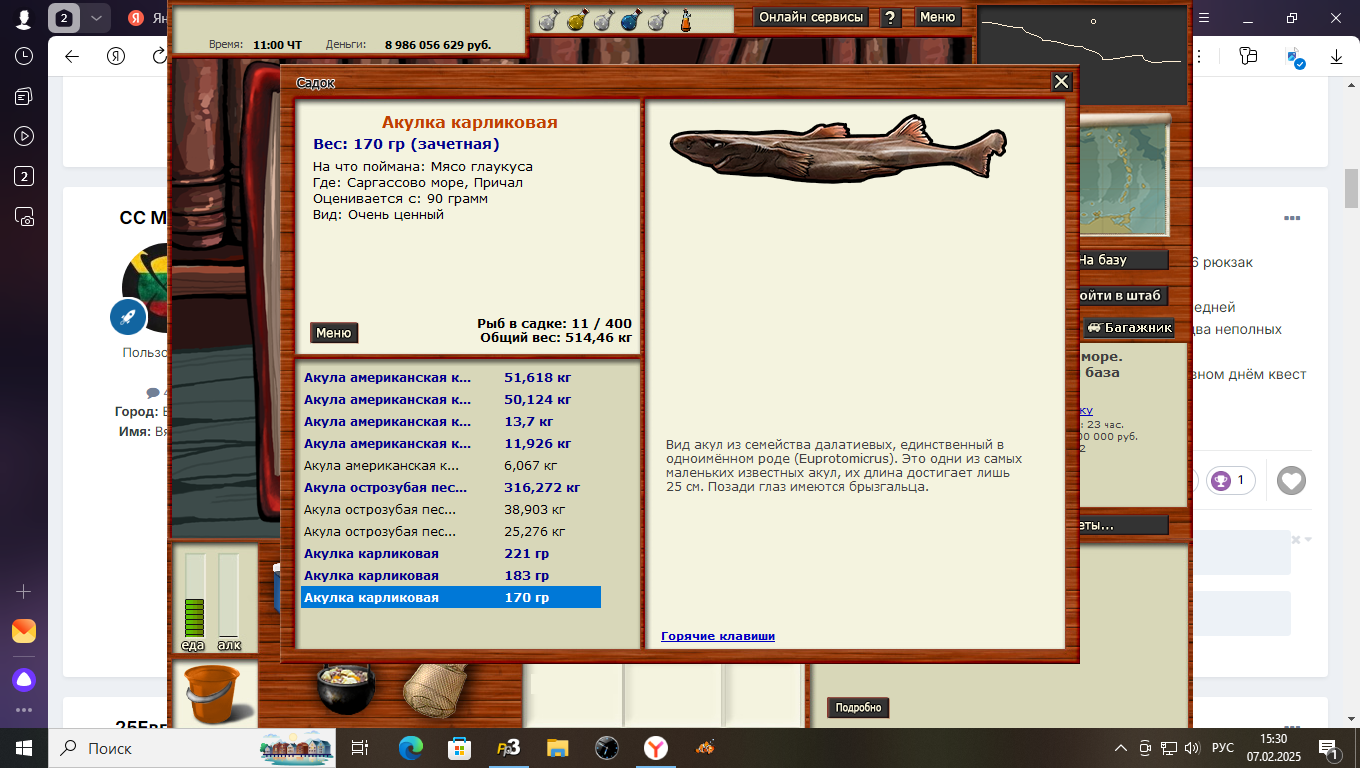 Всем привет! Начал проходить Саргасский промысел,и начал с акул. Все промыслы начинал проходить с нижних рыб с права.4 дня ушло на вылов акул. Акула американская кунья,Мелководье, на мясо осьминога,4.11 ката,много прилова,оси слопали много. Проблем с ней не возникло,утро,ночь,день. С акулой острозубой помучился,но выудил. Райская лагуна,Б.Ж. 5.21 блокнот-уда,прилова много,тоже слопали много наживки, утро,день. Акулка карликовая,с ней возникла проблема,2 дня реала ни на что,ловиться не хотела, в основном сидел на форумных ямках. На блёсенки тоже не пошла,всё ловилось только не акулка. Снова сел за изучения форума,с первого дня,записывал и начал с Причала на красную паралонку, с 21 до 9, не пошло,зашёл во второй раз,и попутно на угад забросил 2 уды, продолжая на спин, и тут где то около часа поклёвка на уду, упс первая влетела, до 5 утра выловил всех. Акулка карликовая, Причал,22.86 чат,мясо глаукуса, ночь,день. Буду рад если кому поможет. Её ловил под химию.