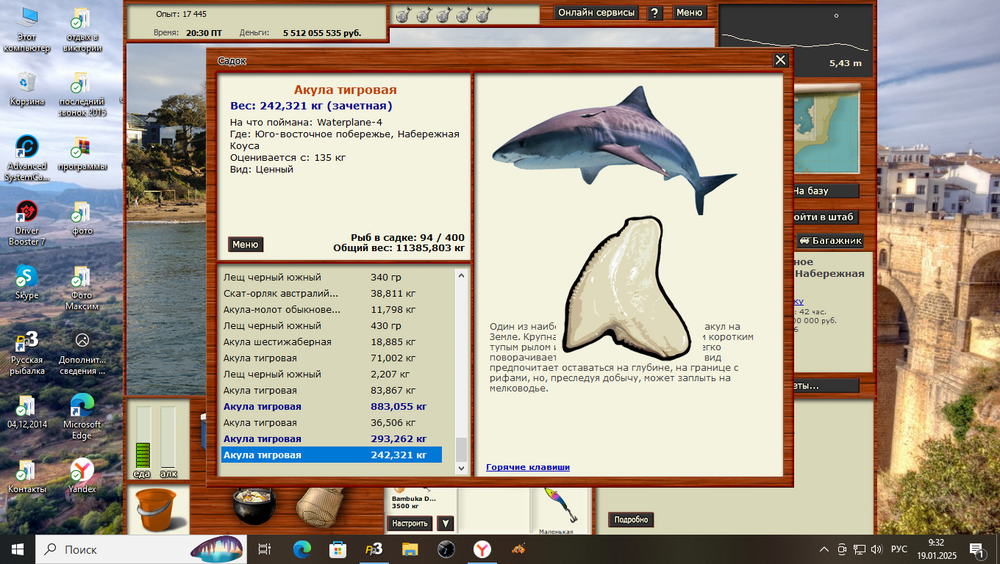 Всем привет! Выловил зуб Акулы тигровой.Ю.В.П.;Набережная Коуса. Заброс бугорок 5.43 игроки, Waterplane-4м/м. Вчера пол дня реала пытался выудить, сегодня только зашёл и вот она,рад буду если кому помог,в поимке Тигровой с зубом.