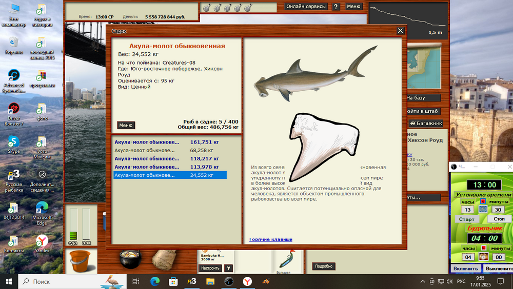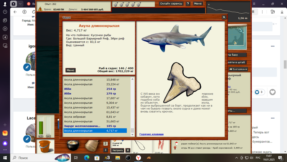 Всем привет! Выловил сегодня зуб ,Акула молот обыкновенная, Ю.В.П.; Хиксон Роуз, на 53 акуле, на 5-ый игродень,заброс 15.2 леска-чат, на Creatures-08 б/м.