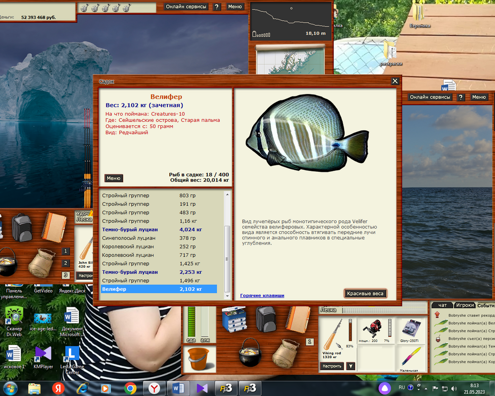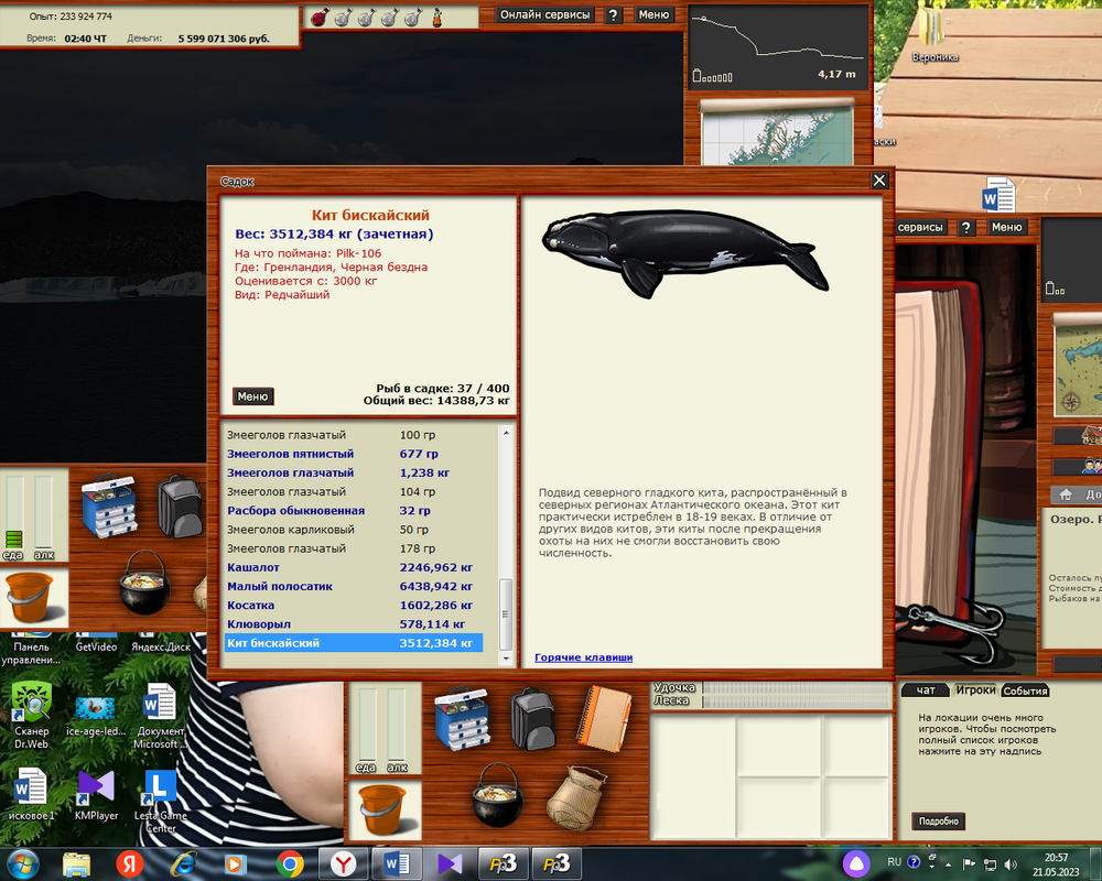 Всем привет. Вчера с утра насухую поймала велифера. Ловила ночью гребня и увидела, что на велифера висит заброс. Игроутром пошла его ловить и в 22 часа он клюнул насухую вообще. Сейшельские острова, Старая пальма, заброс 4.94 ката, блесна маленькая, проводка медленная на викинг с руной кракена. За 2 часа до окончания запрета на него. Спин викинг с кракеном. Кит бискайский 3512,384 кг. Гренландия: Черная бездна, Pilk-106 маленький, проводка средняя, заброс 29.09 шкала уды. Под кровь гребня и су, с четвертого су. Повезло!!!