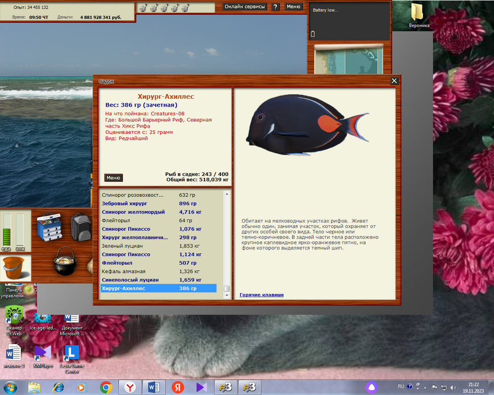 Всем привет! Хирург-ахиллес, Большой Барьерный риф, Северная Часть Хикс Рифа, Creatures-08 м/м., заброс над ямой 18.17 у удочка, 1 см, насухую, спиннинг с руной "Зов кракена", 3 сервер.
