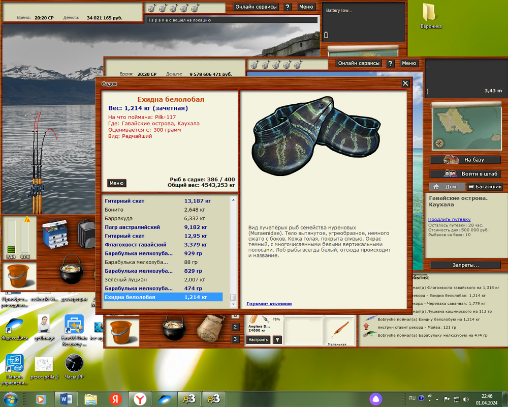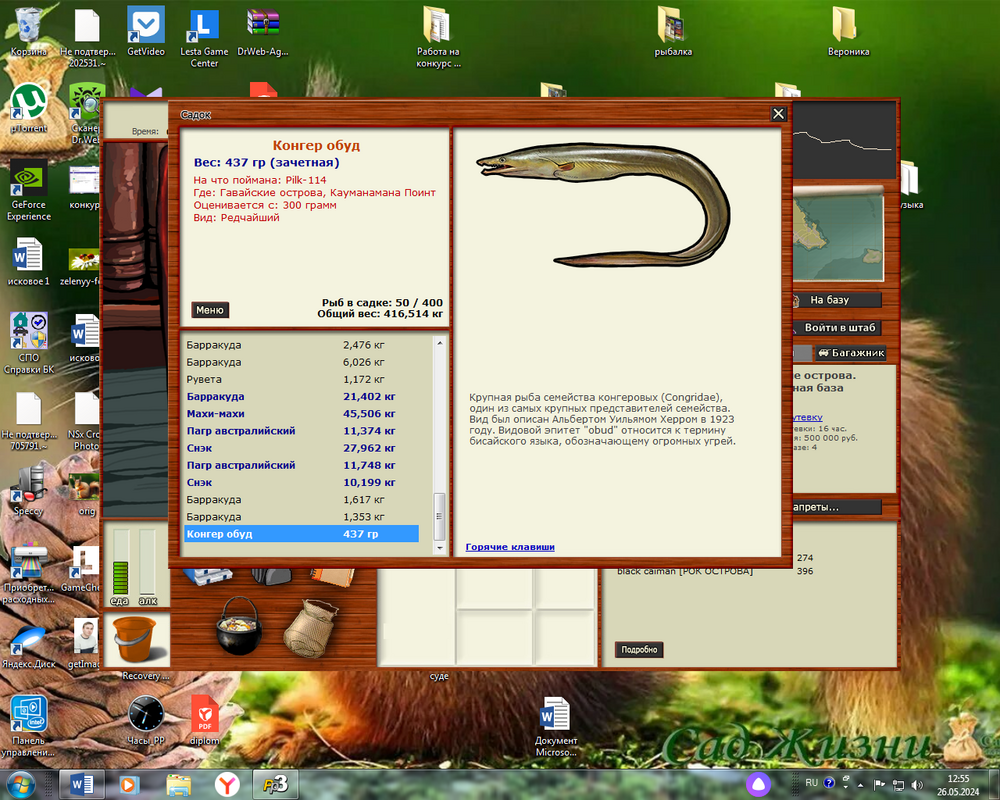 Всем привет. Конгер длинноперый . Поймана на Гавайские острова: Скала Канаха,27.48 короткий заброс, "к" игроки, Пилк 111 м/м. Конгер лорда Хоу Поймана на Гавайские острова: Мокупапапа, Большой живец яма 29.60 рюкзак/блокнот, дно, ночь. Второго (оба 10+кг) поймала при ловле японского конгера. Конгер японский. Поймана на Гавайские острова:Заповедник Мокулуа Айлендс, Pilk-117.м м. заброс 20.90 износ каты. Каранксы. Тилле на Гавайские острова:Заповедник Мокулуа Айлендс, Pilk-113 и 114 ср/ср. заброс 20.90 износ каты, желтоперый везде на пилки мелкие на Мокупапапе берет, пока искала широкоротого,который долго и упорно не шел, поймала его Гавайские острова: Мокупапапа, укороченный заброс 30.20 ящик/рюкзак на ПИЛК 103!!!!! маленький медленно. Неалот вредный. Долго не сдавался. 5 лока, 12.60 "к" игроки, нахлыст, кальмар, с 23 до 4 ч. И барабулька на закуску...6,01 чат, морской червь и на блесну Креутурес 10 мал/медл 5.76 индикатор каты, вечер, ночь, утро, иногда может и днём заскочить. Квест пройден! Всем удачи в его прохождении!!!!!
