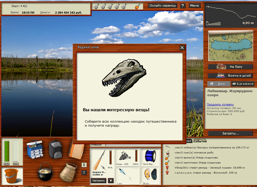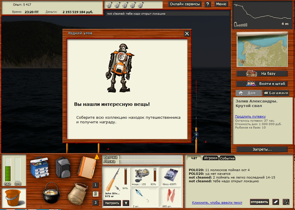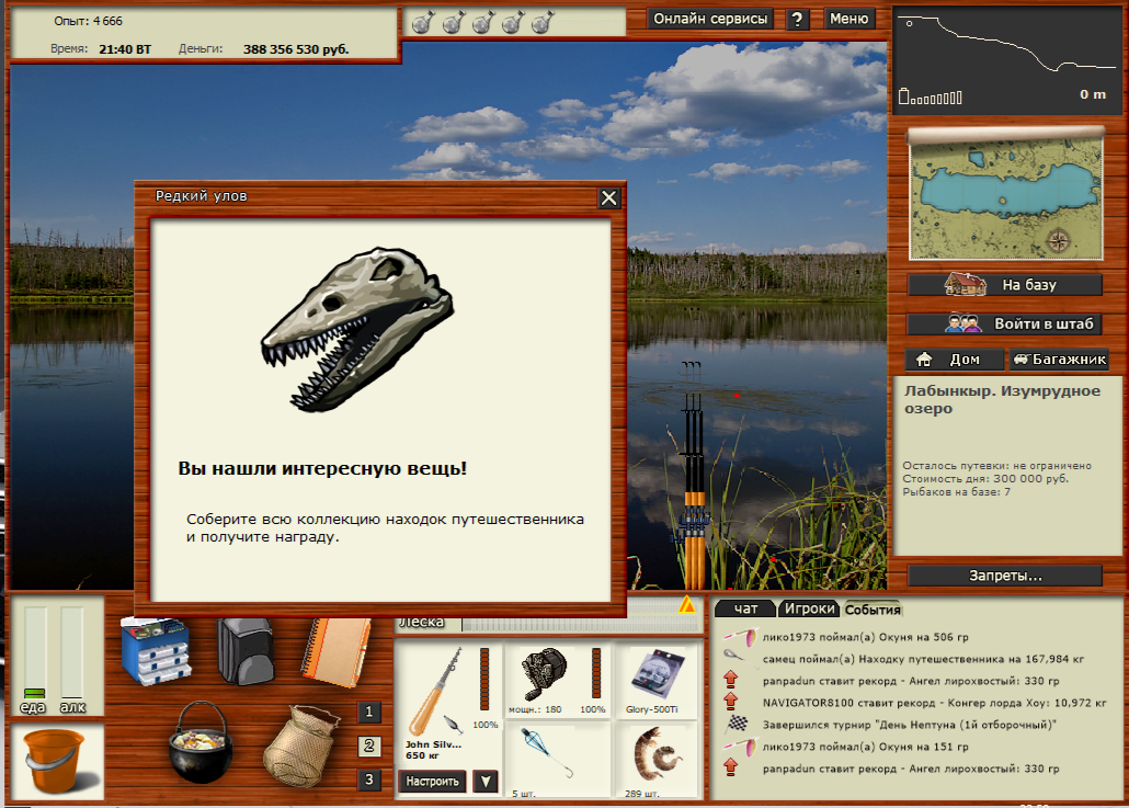 BUHHU PYH Опубликовано 8 августа Опубликовано 8 августа Череп. Это как раз тот случай, в котором надо задействовать СУ. Отсидев суток 8-10 под удачу на Изумрудном озере Лабынкыра безрезультатно, перечитал форум более внимательно. Обратил внимание на то, что люди месяцами сидят с нолем. Решил не терять время. И еще: череп там клюет только на моллюск, поклевки рыбы на моллюск очень редкие, т.е. реально спишь за компом. Также немаловажно, что редких рыб на этой локе нет, т.е. некому перехватывать под СУ. Именно поэтому купил СУ и вперед. Обращаю ваше внимание, что надо приготовиться к долгому ожиданию. У меня клюнул на вторые игросутки, читал, что и по четверо игросуток народ ждал. Так что если долго не клюет, то это нормально, комп не завис, терпеливо ждите. 1-й сервер, 6.57 над катой, 100кг., уда мэджик с камнем удачи. Всем удачи! Пошел трилобит ловить, последний в квесте. 4 Цитата