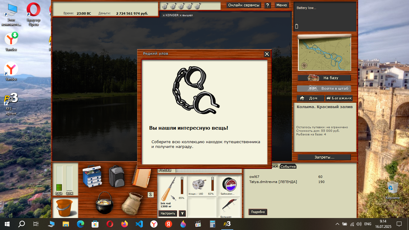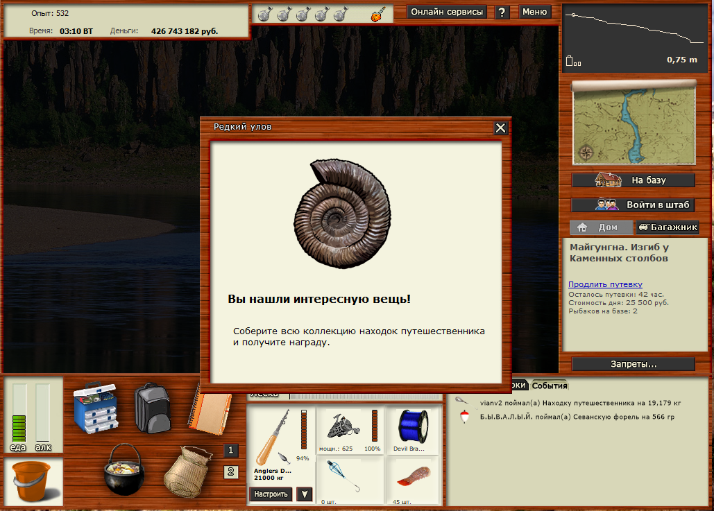BUHHU PYH Опубликовано 3 июня Опубликовано 3 июня (изменено) Кандалы Колыма Белая береза уда Гатеринг 2.67 между рюкзаком и блокнотом у берега на икру, под удачей, 1-й сервер, с руной камень удачи, на первые сутки. Хотя до этого четверо суток (двое по два раза) пробовал и с удачей, не фартило. И еще: ранее пробовал какой-то артефакт ловить под удачу с кладоловом - не помогло. Изменено 3 июня пользователем Максимус Исправление стиля. Цитата