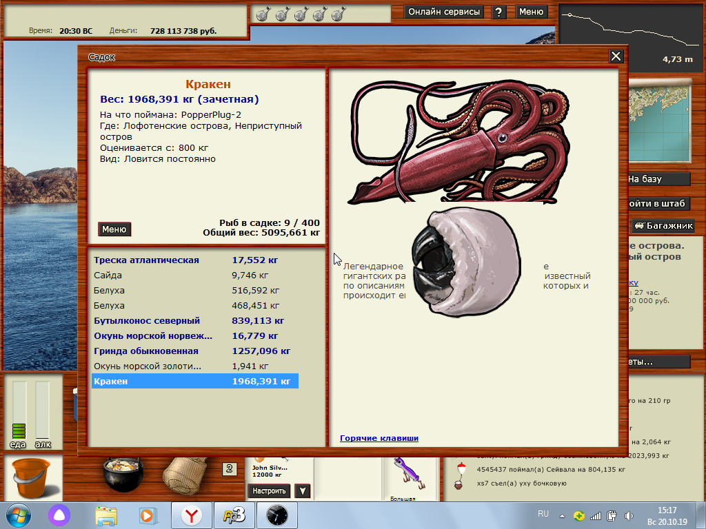 Arturiukas Опубликовано 15 октября, 2019 Опубликовано 15 октября, 2019 Лофотенские острова - Южный мыс - Кракен 1484,9 кг. - 32,31 ката/ Pilk-111. б.м. ровно в полночь 0:00 на 3-ем сервере, без химии, на кальмаровый спин с кракеном. Ловил очень долго, даже не считал игровых ночей, пробовал и под «супер»: 9 ночей подряд по 3 СУ (в той же яме!), не сдавался. Видимо пришло время, и сервер отдал «за даром»…. Кракен 1484,9 кг - 17818800 руб. (Цена обычная) Клюв Кракена присутствует 1800 очков за редкие виды. 3 Цитата