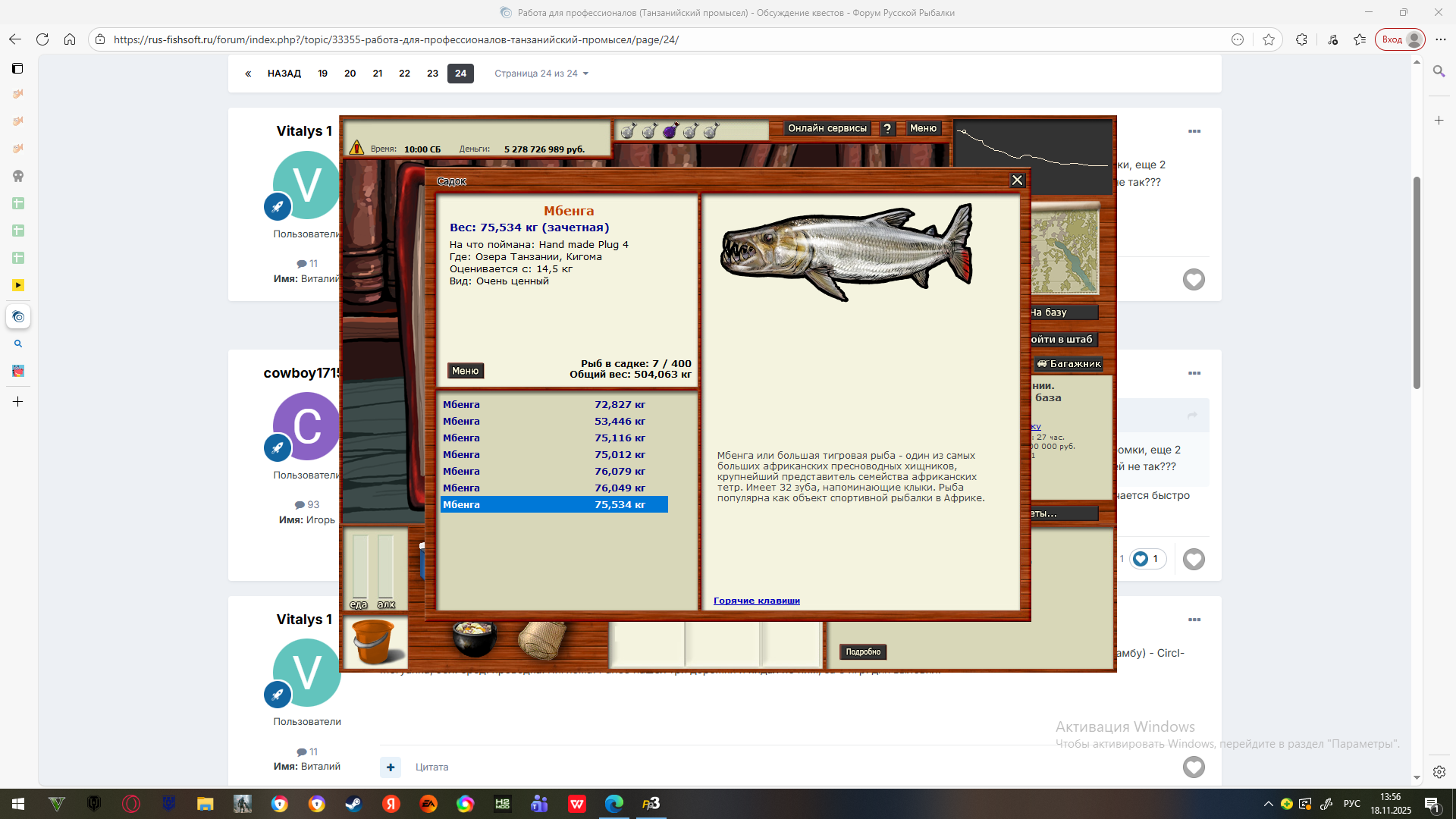 Слава533 Опубликовано 2 февраля, 2025 Опубликовано 2 февраля, 2025 (изменено) Всем доброго времени суток сегодня закрыл квест Танзанийский промысел. Самым сложным, как и для многих рыбаков оказался для меня протоптер, но долго очень пришлось выискивать бурого, на Рухуху два вышло из разных ямок 3.14 и 2.42 на мола и улю, и как отрубило, перелопатил весь форум, спасибо Всем кто делится информацией, вернулся на ББК, где ранее выловил малых протоптеров, выловил еще 2 малых но и там не захотел ловиться бурый, помимо этого на ББК как мне показалось много прилова, вернулся на Рухуху и уже с остатком в два часа квестового времени выловил третьего бурого, да и добавлю по мраморному, без проблем выловил на Ниле, локация золотой берег. Спасибо Всем кто делится информацией и удачи в прохождении этого интересного квеста. Спойлер Изменено 2 февраля, 2025 пользователем Максимус Форматирование. 1 Цитата
