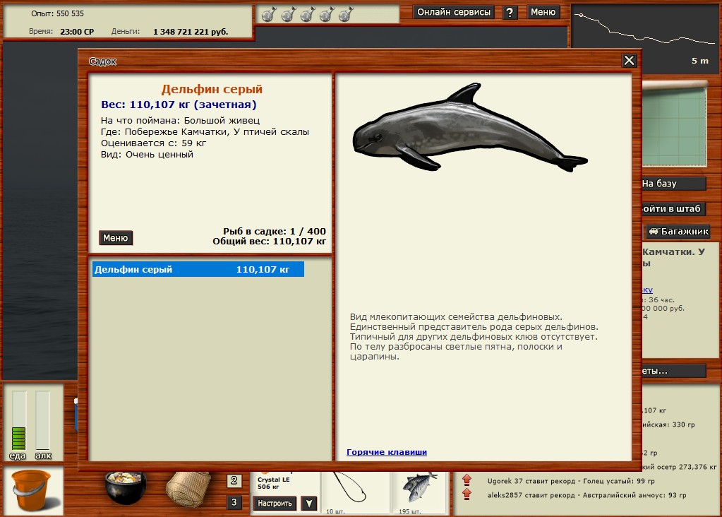 FinFisher Опубликовано 1 июня Опубликовано 1 июня Всем доброго времени суток. Дельфин серый 20,491кг. Поймал на Побережье Камчатки: Стоянка, Pilk-102 Б.медл. и Дельфин серый 165,945 кг. Поймал на Побережье Камчатки: Стоянка, Мясо глубинного краба. Пойманы днём. Ямки не запоминал, так как часто менял точки лова при поиске Морского монаха. Ловил на сухую. Дельфины пришли на третьи игровые сутки. Цитата