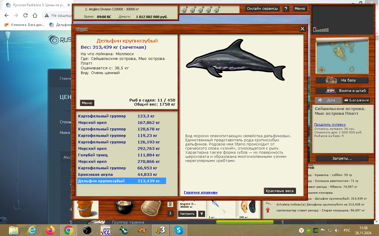 abakanes Опубликовано 22 ноября, 2024 Опубликовано 22 ноября, 2024 приветДельфин китайский 150,904 кг. Поймана на Большой Барьерный Риф: Андервуд Шол, Мясо кальмара.6070 ката.дно. Спойлер Спойлер 1 Цитата