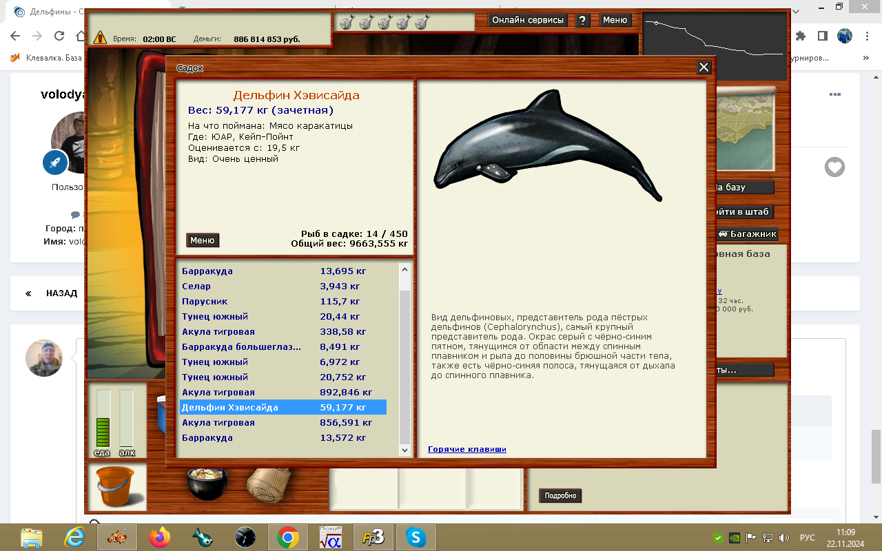 IIITYPMOBNK Опубликовано 26 ноября, 2024 Опубликовано 26 ноября, 2024 Дельфин хевисайда 19,513кг пойман на ЮАР кейп-поинт мясо лобстера яма 19,13 события в 21:40 игрового Дельфин тихоокеанский 52,003 кг пойман на большой шантар остров кекур пилк 111 б/ср Цитата
