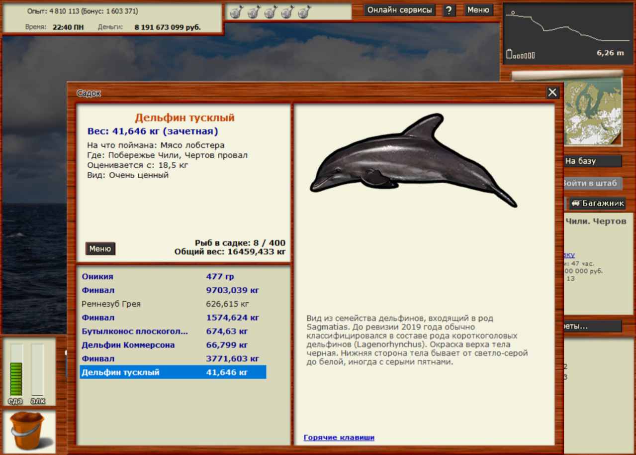 Рыбак 661 Опубликовано 7 декабря, 2024 Опубликовано 7 декабря, 2024 (изменено) Дельфин тусклый 41,646 кг. Поймана на Побережье Чили: Чертов провал, Мясо лобстера, нахлыст, 22,11 леска, 3 сервер, в 22,40. В той же ямке в предыдущие игровые сутки попалось три дельфина Коммерсона, полностью насухую. Спойлер Изменено 11 декабря, 2024 пользователем Максимус Установка спойлера. 1 Цитата