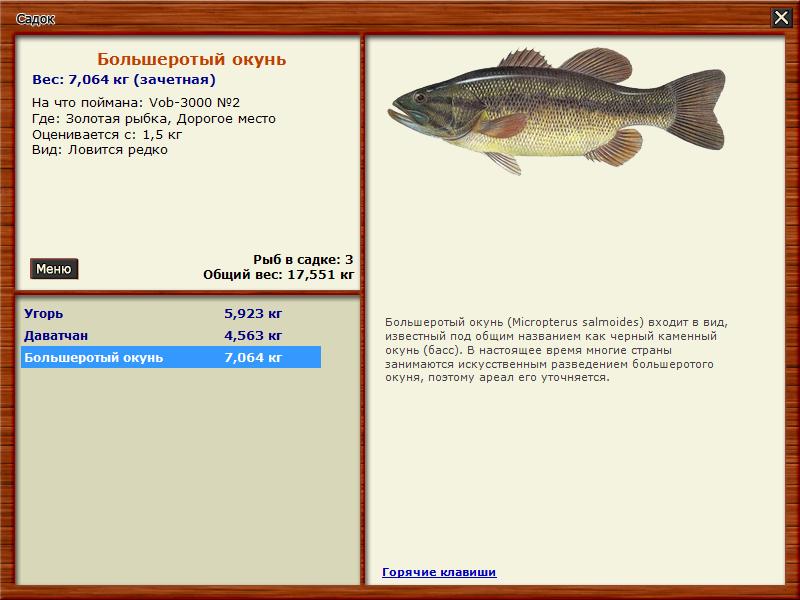 профи Опубликовано 30 сентября, 2010 Опубликовано 30 сентября, 2010 Большеротый окунь Максимальная длина, см.: 97 Максимальный вес, кг.: 10 Описание рыбы: Тело стройное, удлиненное, сжатое с боков. Высота тела составляет 1/3 его длины. Верхняя часть головы и спина от темно-оливкового до темно-зеленого цвета. Бока светлее, с серебристым отливом и мелкими коричневыми пятнышками. Брюхо белое. Вдоль середины тела от носа через глаз до хвоста идет широкая прерывистая черная полоса, у молоди она четкая, с возрастом бледнеет. Старые особи мрачного серо-зеленого цвета. Голова большая, ее длина равна высоте тела. Большой рот, верхняя челюсть заходит за вертикаль заднего края глаза. Нижняя челюсть длиннее верхней, выступает вперед. Глаза крупные. Спинные плавники соединены друг с другом, но на границе между ними глубокая впадина. Хвост широкий, с небольшой выемкой. Чешуя мелкая, покрывает все тело и бока головы. Обитает в неглубоких (до 6 м) тепловодных стоячих озерах и прудах, в медленнотекущих речках, вблизи прибрежных зарослей. Держится часто в укрытии под корягами или в пещерах и норах под берегом. Крупный хищник со зрительной ориентацией. Растет быстро, причем самки быстрее самцов. Половое созревание наступает в 3-4 года у самцов и в 4-5 лет у самок при длине 25-35 см. Ареал обитания: Акклиматизированный вид. Родина - Северная Америка, где естественный ареал охватывает территорию Канады и США в пределах бассейнов Великих Озер и р.Миссисипи с притоками. От атлантического побережья ареал простирается на восток и на юг до Мексиканского залива. В Россию завезен в озера Абрау и Лиманчик под Новороссийском и в подмосковные пруды. Отмечен в бассейне Иваньковского водохранилища. Однако большой численности нигде не имеет, встречается единично. Рацион: Молодь до 3-5 см длиной питается зоопланктоном, личинками поденок и других насекомых, бокоплавами; после достижения 5-7 см длины поедает поденок, стрекоз, креветок, и впервые в ее питании появляются личинки рыб. Взрослые особи питаются рыбой, креветками, лягушками, моллюсками. Утром и вечером ловит добычу у поверхности, а днем - в толще воды и у дна. Иногда охотится стаями вблизи берега (во время ската молоди других видов рыб). Часто потребляет собственную молодь.